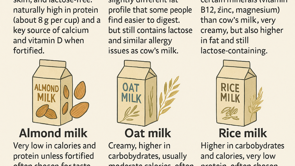 Main types of milk you’ll see Pros, cons, and typical costs Animal milks (cow, goat, sheep) Cow’s milk Goat’s milk Sheep’s milk Plant milks (almond, oat, soy, rice, coconut) Almond milk Oat milk Soy milk Rice milk Coconut milk beverage Cost snapshot in U.S. stores This means most plant milks cost about 2–3 times more per cup than standard cow’s milk, with…