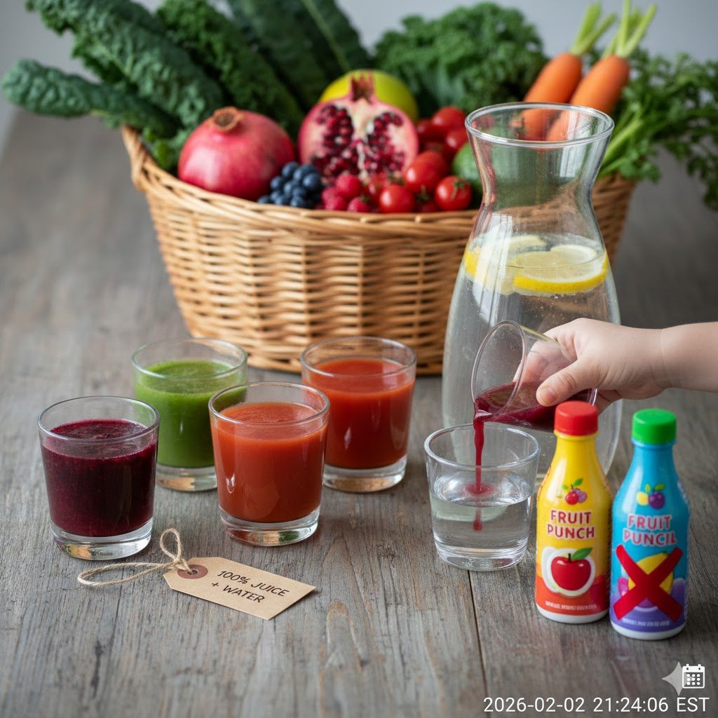 • Avoid: “juice drinks,” sweet teas, and flavored waters with added sugar; prioritize labels that say “100% juice” with no added sweeteners.
